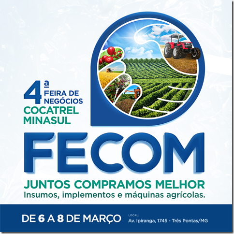 Com o tema “Intercooperação no fortalecimento da cadeia produtiva”, a Cocatrel e a Minasul se unem novamente para a realização da 4ª Feira de Negócios Cocatrel Minasul (FECOM). A feira que será nos dias 6, 7 e 8 de março, no Espaço Cocatrel, em Três Pontas.