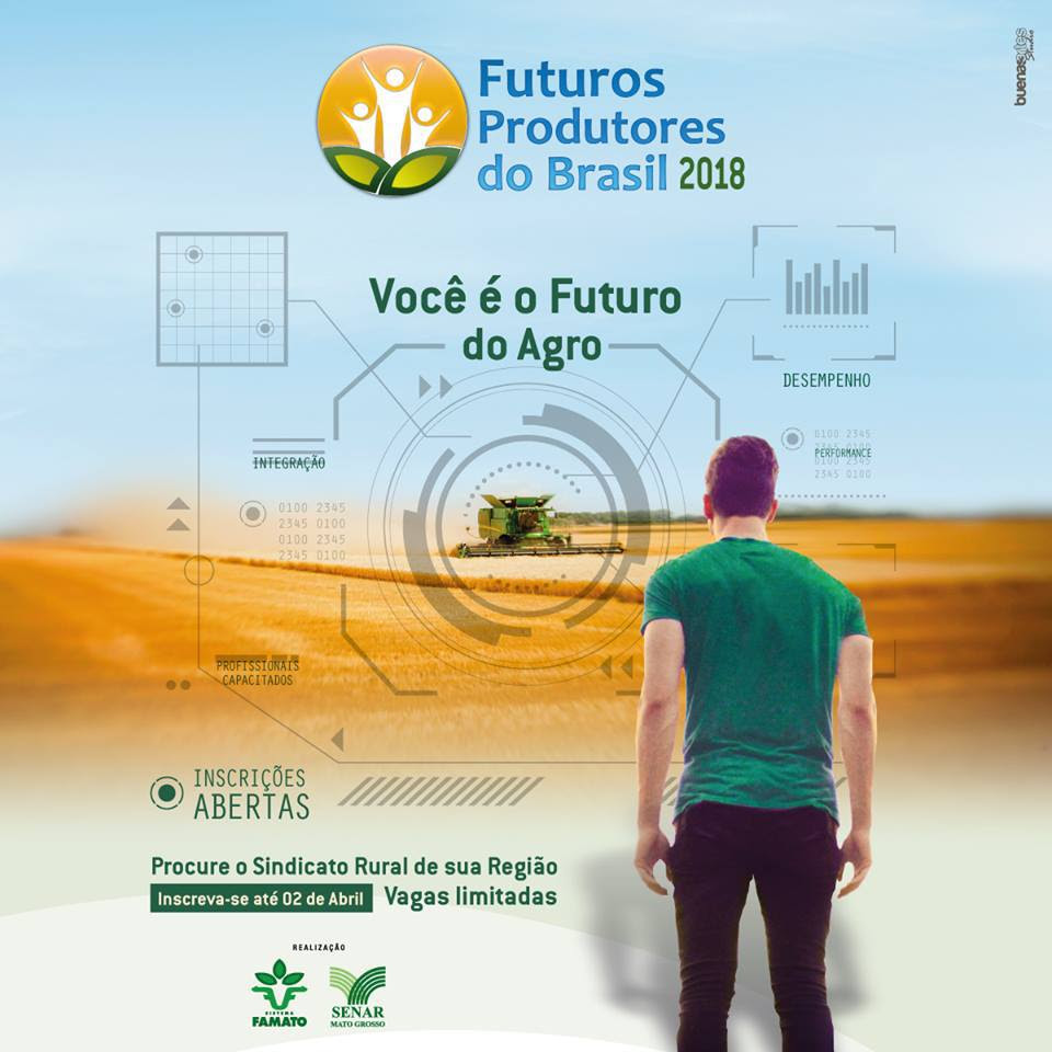 Estão abertas até o dia 2 de abril as inscrições para o projeto Futuros Produtores do Brasil 2018. A iniciativa, que nasceu na Federação da Agricultura e Pecuária de Mato Grosso (Famato), em parceria com o Serviço Nacional de Aprendizagem Rural (Senar-MT) e apoio dos Sindicatos Rurais do estado, é voltado para os jovens, filhos de produtores rurais, com o objetivo de despertar o interesse pelo agro, fomentar a formação de lideranças jovens e apresentar as inúmeras oportunidades de carreira no agronegócio.