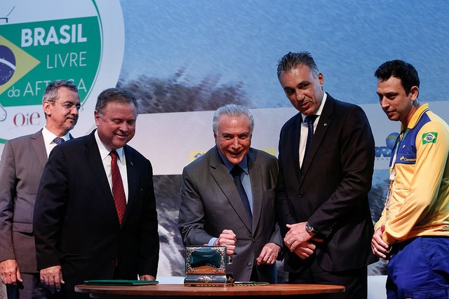 Em seu discurso, Temer disse que deverá comparecer à 86ª Sessão Geral da Assembleia Mundial da OIE (Organização Mundial de Saúde Animal), em Paris, no dia 24 de maio, data em que está prevista a entrega ao governo brasileiro do certificado internacional de zona livre de febre aftosa com vacinação.