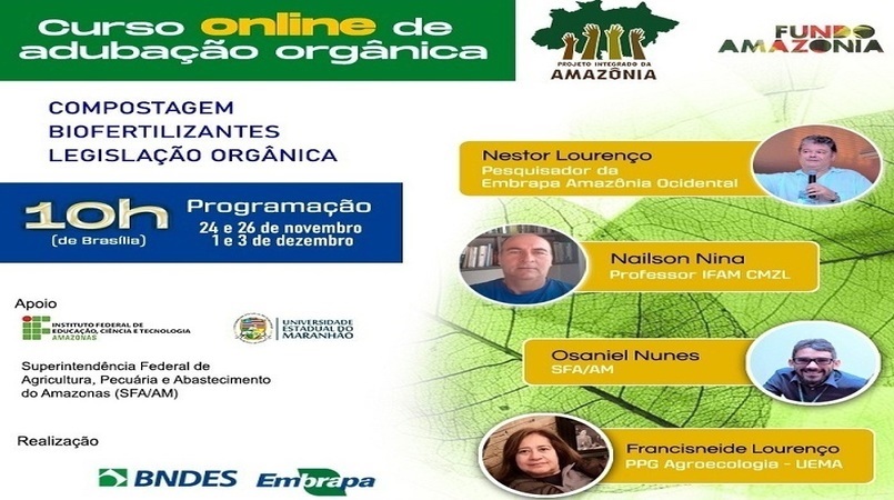 A Embrapa Amazônia Ocidental está promovendo um curso sobre adubação orgânica, que será ministrado totalmente on-line em quatro encontros, nos dias 24 e 26 novembro; e 01 e 03 de dezembro. O objetivo é disponibilizar conhecimentos, habilidades e atitudes necessárias para contribuírem na implementação de práticas agroecológicas, como a adubação orgânica.